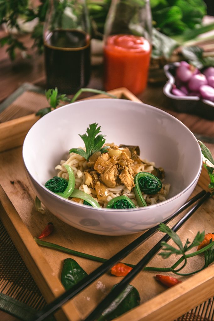- Siap diracik: campurkan 2 sendok makan minyak ayam kedalam mangkuk mie, aduk rata agar mie tidak lengket satu dengan yang lain. Beri taburan bawang daun dan sawi yang sudah direbus. Tambahkan ayam beserta kaldu ayam.