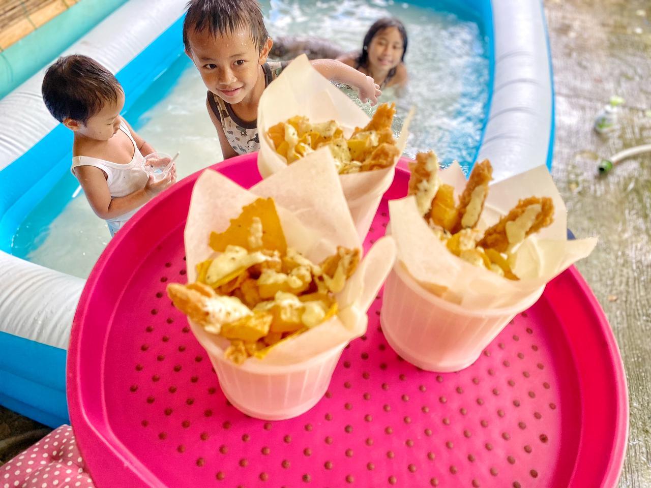 Ini jadinya 5 porsi dengan plating telur krispi, kentang goreng, corn chips. Tiga wadah untuk anak anak dan 2 lagi untuk orang tua ( chips masih sisa banyak), diguyur saus putih atau bechamel sauce.